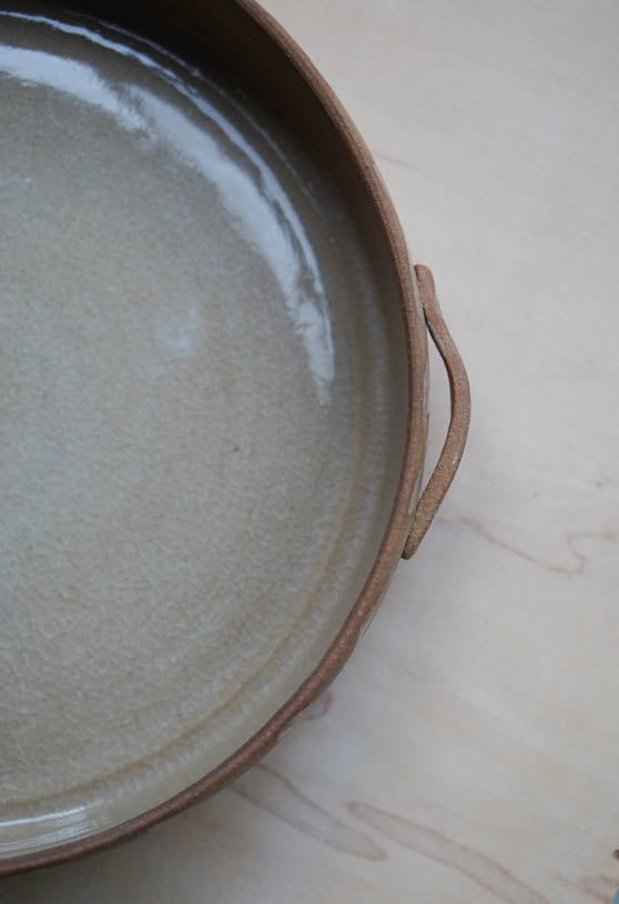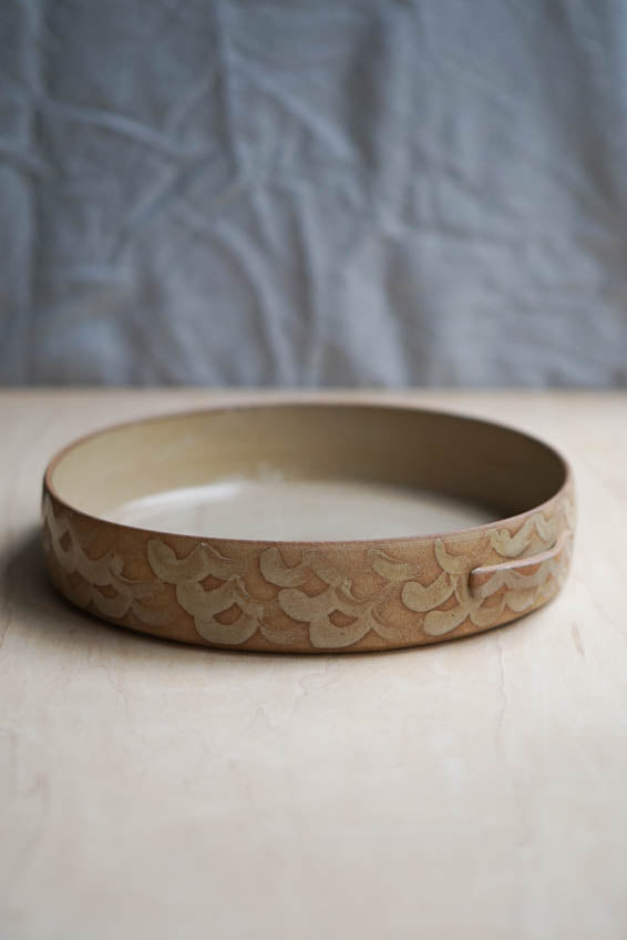 This tray/bowll , crafted from earthy brown clay, is glazed only on the interior and embellished with a flowing, wave-inspired decoration. Featuring a minimalist yet playful design, it's perfect for presenting an array of dishes or as a charming fruit bowl on your counter